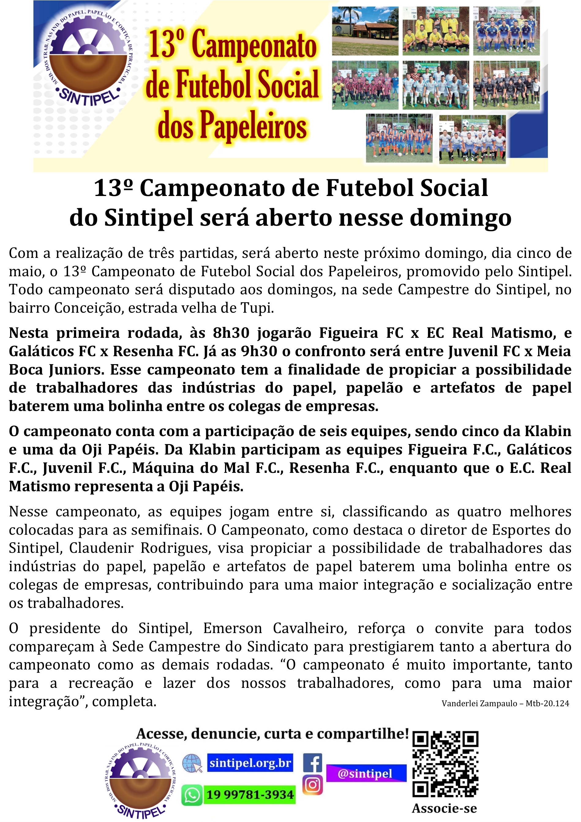 13º Campeonato de Futebol Social do Sintipel será aberto nesse domingo