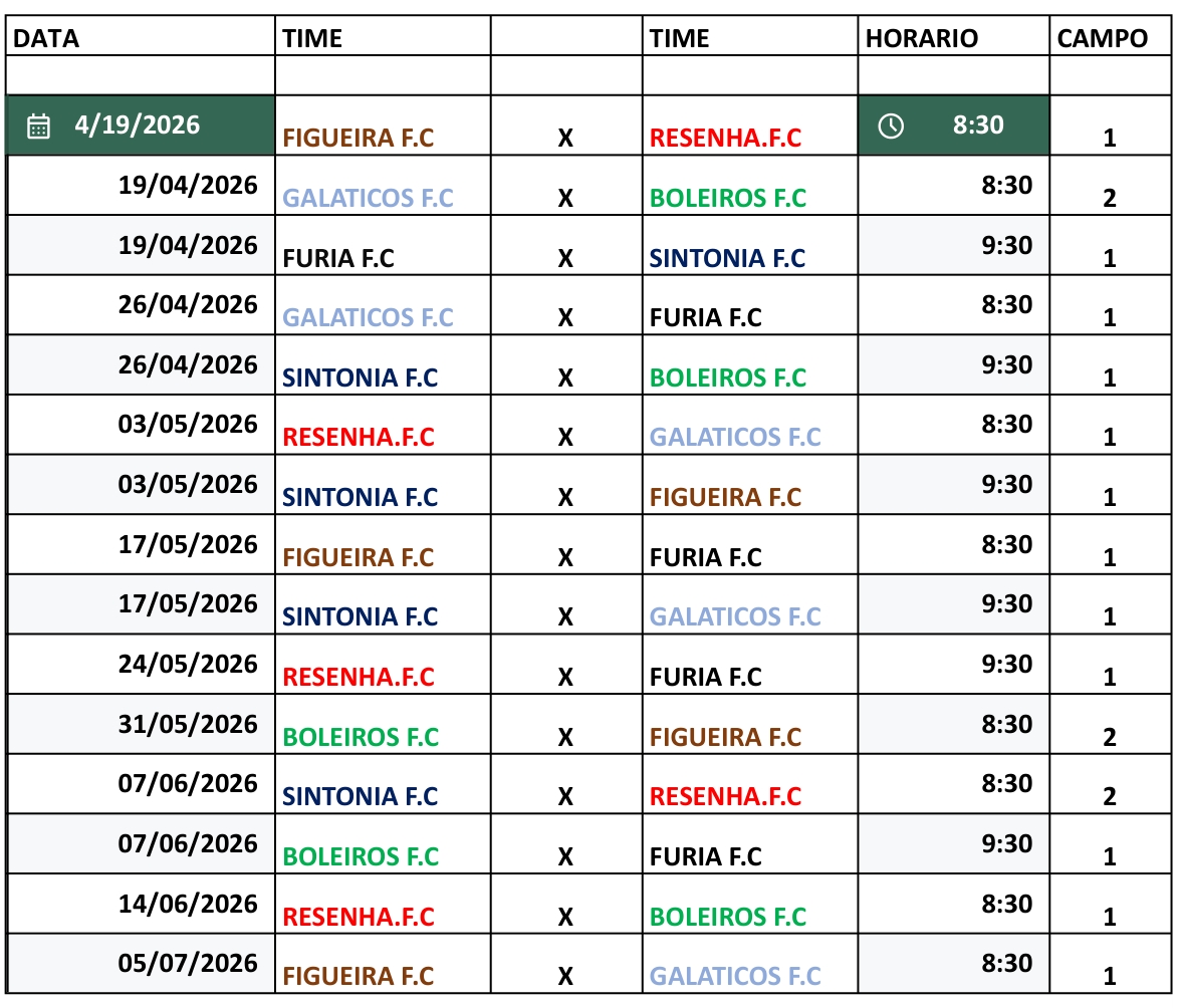 Todas as equipes participantes jogarão na primeira rodada, com o Figueira FC encarando o Resenha FC, às 8h30, mesmo horário que o Galáticos jogará com o Boleiros FC. Já as 9h30, se enfrentaram Fúria FC e Sintonia FC.