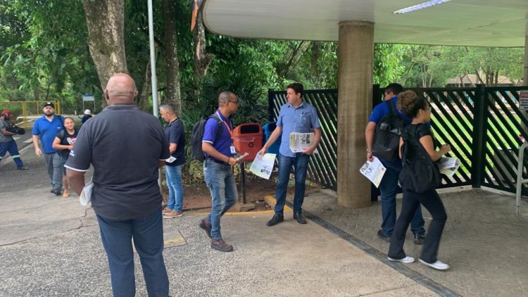 Diretores do Sintipel na porta das empresas panfletando