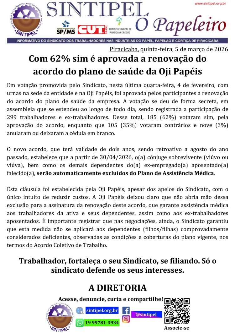 Com 62% sim é aprovada a renovação do acordo do plano de saúde da Oji Papéis