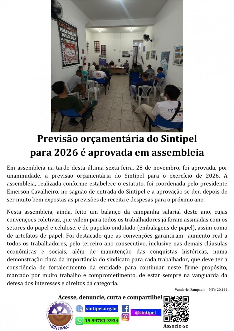 Previsão orçamentária do Sintipel para 2026 é aprovada em assembleia