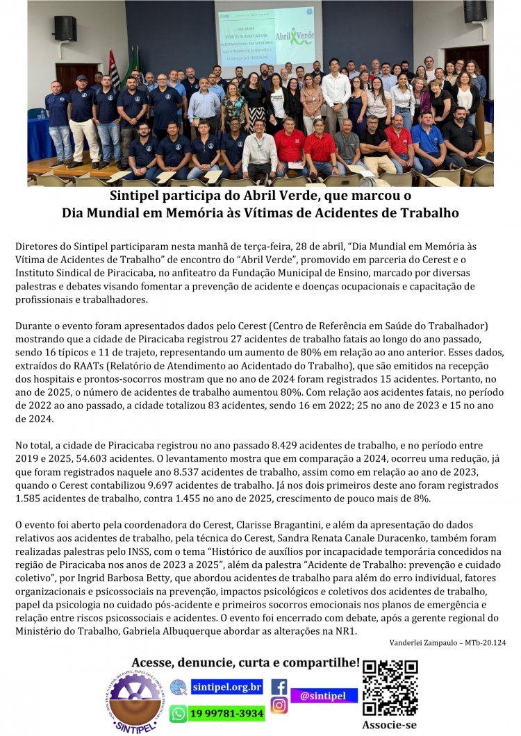 Sintipel participa do Abril Verde, que marcou o Dia Mundial em Memória às Vítimas de Acidentes de Trabalho