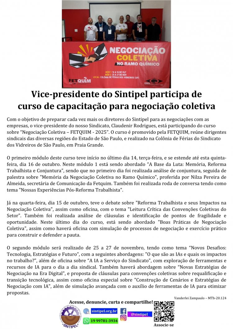 Vice-presidente do Sintipel participa de curso de capacitação para negociação coletiva