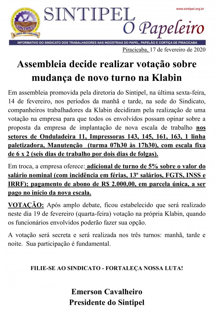 Klabin unidade Pira 2 (Figueira) Marcada assembleia para definição
