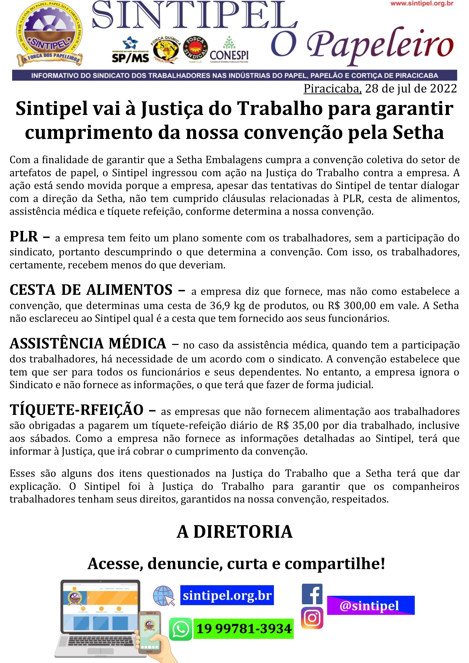 Sintipel vai à Justiça do Trabalho para garantir cumprimento da nossa convenção pela Setha