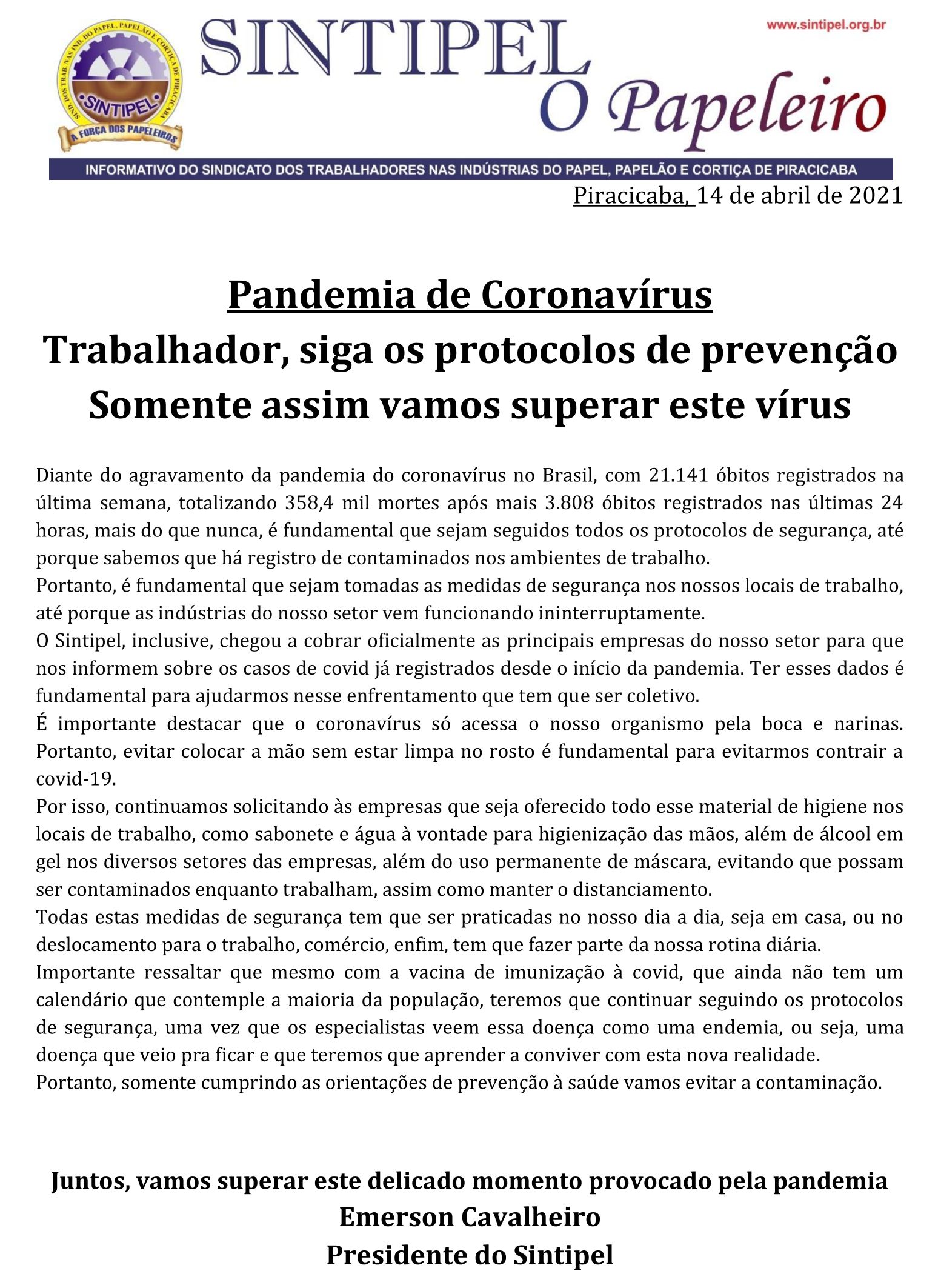 Trabalhador, siga os protocolos de prevenção Somente assim vamos superar este vírus