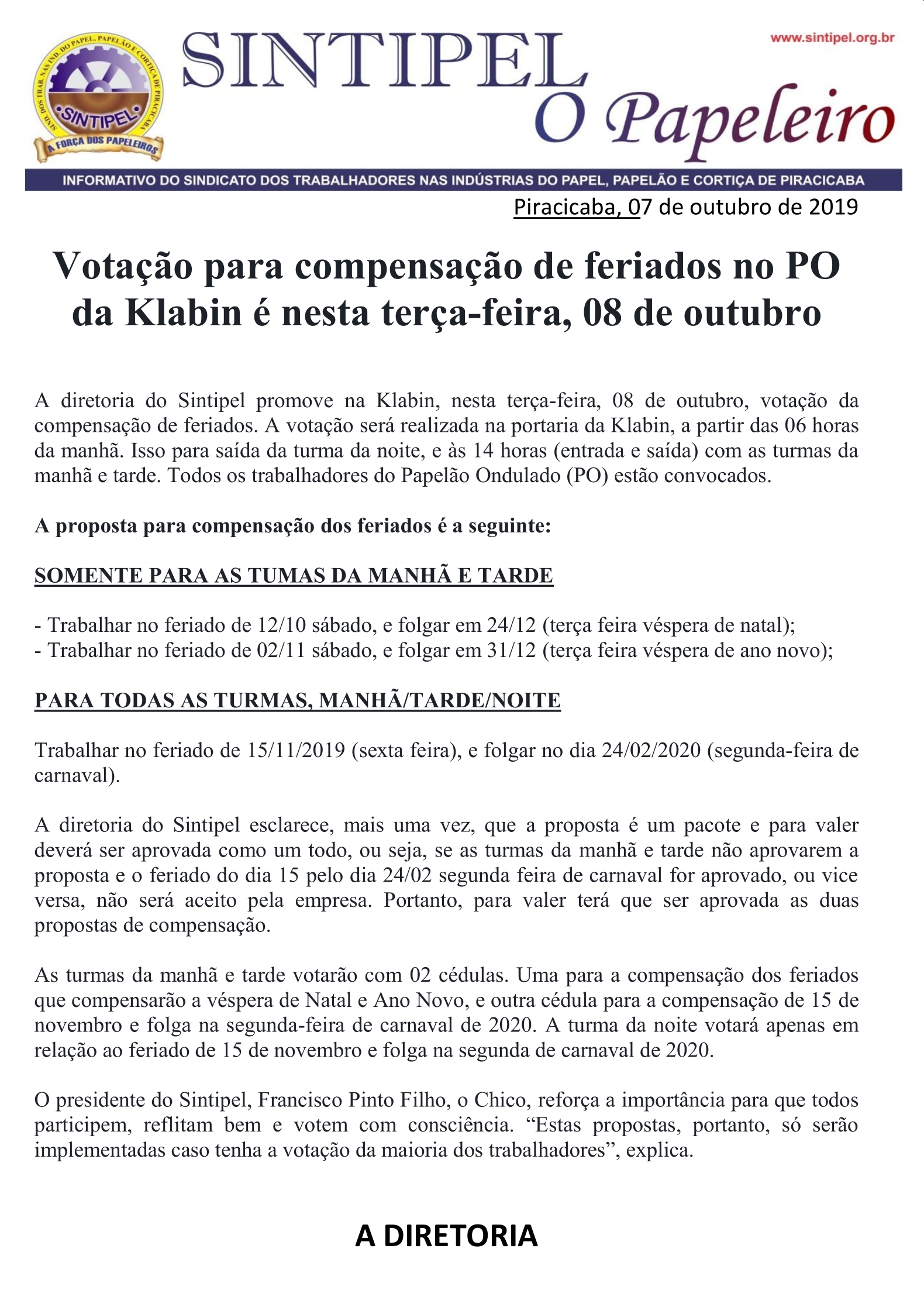 Votação para compensação de feriados no PO da Klabin é nesta terça-feira, 08 de outubro